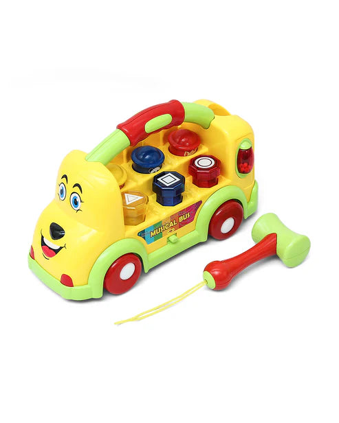Take a fun-filled trip with our Musical Bus, a captivating and interactive toy that combines a push-along vehicle with a multi-activity learning center. This colorful bus is designed to keep your child engaged with a variety of hands-on features. The roof includes a keyboard for musical exploration and a small book with pages to turn, while the side features buttons that play different animal sounds. The front of the bus has a steering wheel, a gear shifter, and a door that opens and closes, all perfect for imaginative role-playing. With its flashing lights, catchy music, and engaging activities, this musical bus is a wonderful way to stimulate your child's senses and support their early learning journey.